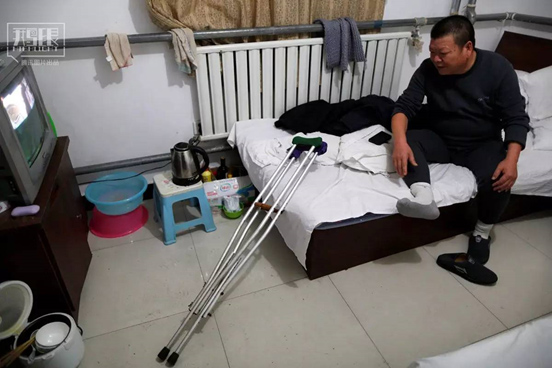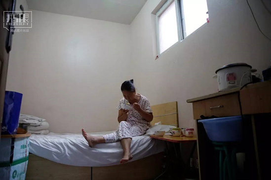 每天,在北京的知名腫瘤醫(yī)院,都有不少背著重重行囊的癌癥患者和家屬沖著優(yōu)質(zhì)的醫(yī)療資源蜂擁而來。被病痛和焦慮折磨的群體中,有許多人出于經(jīng)濟(jì)貧困、療程漫長等種種原因,只能選擇蝸居在醫(yī)院周邊居民住宅中一個個被分割出來的狹小空間內(nèi)……這些聚集著癌癥患者的簡易民居,被人們稱為“癌癥旅館”。圖為2016年6月23日,王女士在北京的一個癌癥旅館里休息。攝影:Kim Kyung-Hoon (來自:騰訊圖片)