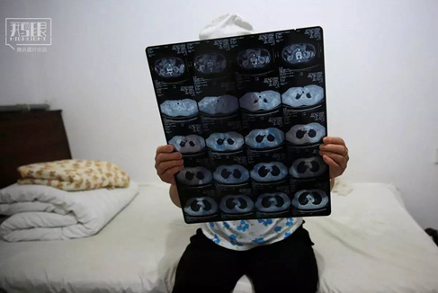 黃阿姨在2013年被診斷出直腸癌,從那時起為看病已經(jīng)花費(fèi)超過27萬。圖為2016年6月22日,北京,黃阿姨展示自己的CT掃描片。