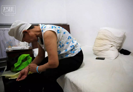 面對這種情況,一些患癌家庭在向親戚朋友借完之后,不得不求助于地下錢莊。而為了能盡快看上病,向黃牛買號,給醫(yī)生塞紅包也屢見不鮮。圖為2016年6月22日,黃阿姨坐在床上。