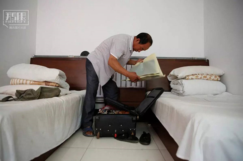 患者和家屬一般會在癌癥旅館呆上幾個月或者一年時間,然后選擇回家。圖為2016年6月23日,潘先生在房間收拾行李箱,準(zhǔn)備離開癌癥旅館。