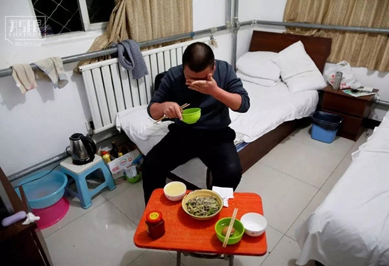 2016年1月13日,袁運(yùn)平(音譯)在旅館房間吃飯時擦汗。飯是他兒子做的。