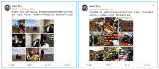 崔永元在微博上留言道:“平生第一次不是以顧客的身份逛市場—中國來的大進口商,尋找健康安全食品。”很明顯崔永元此次來俄的目的是沖著健康食品來的。除了考察菜市場,崔永元還在莫斯科豪華游輪上和普希金餐廳上體驗俄餐。援引崔永元的微博上的原話:“在莫斯科,游船上,喝著香檳,吃著全部安全的非轉基因食品……”。