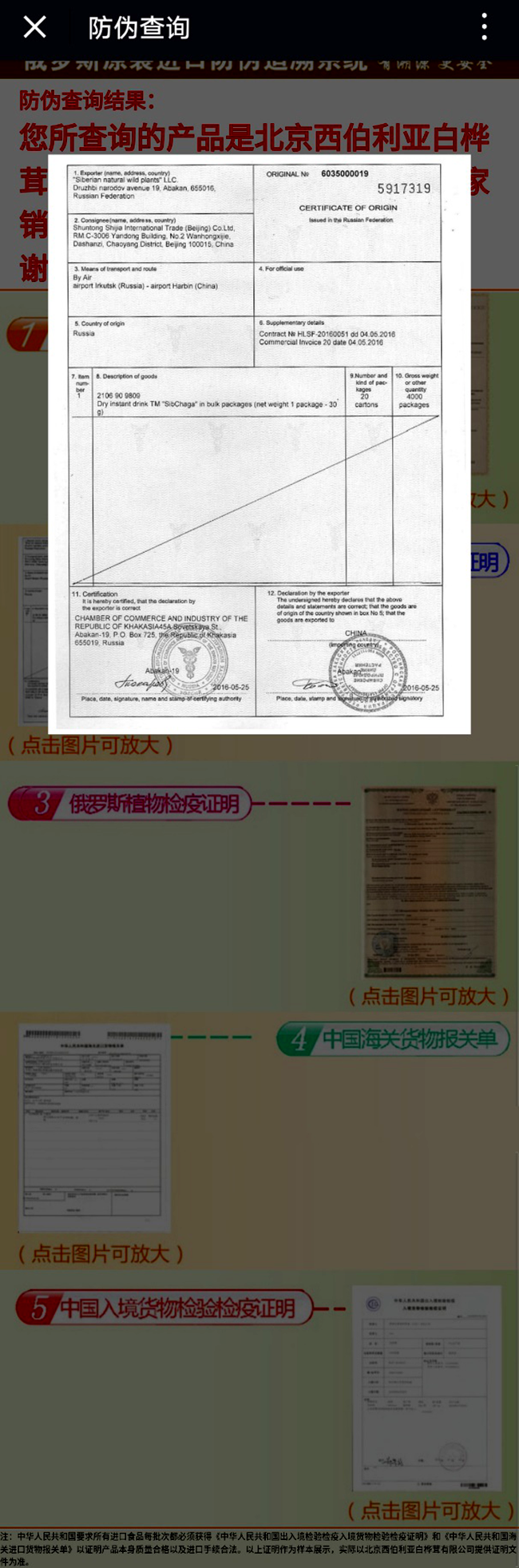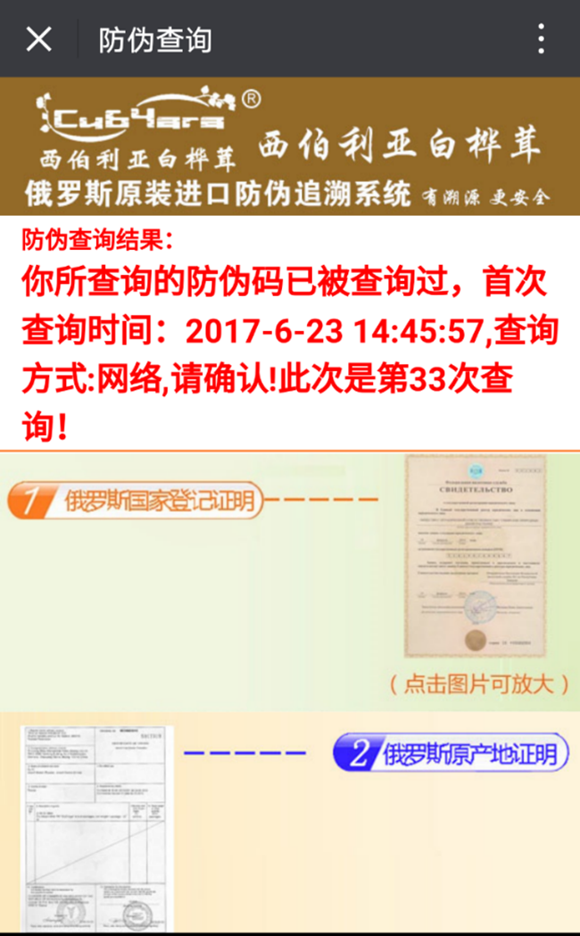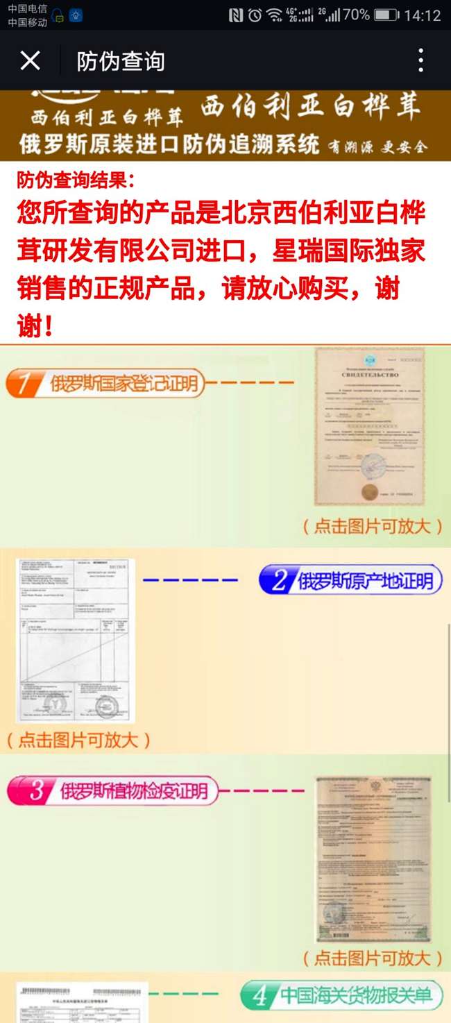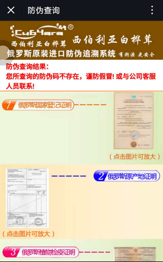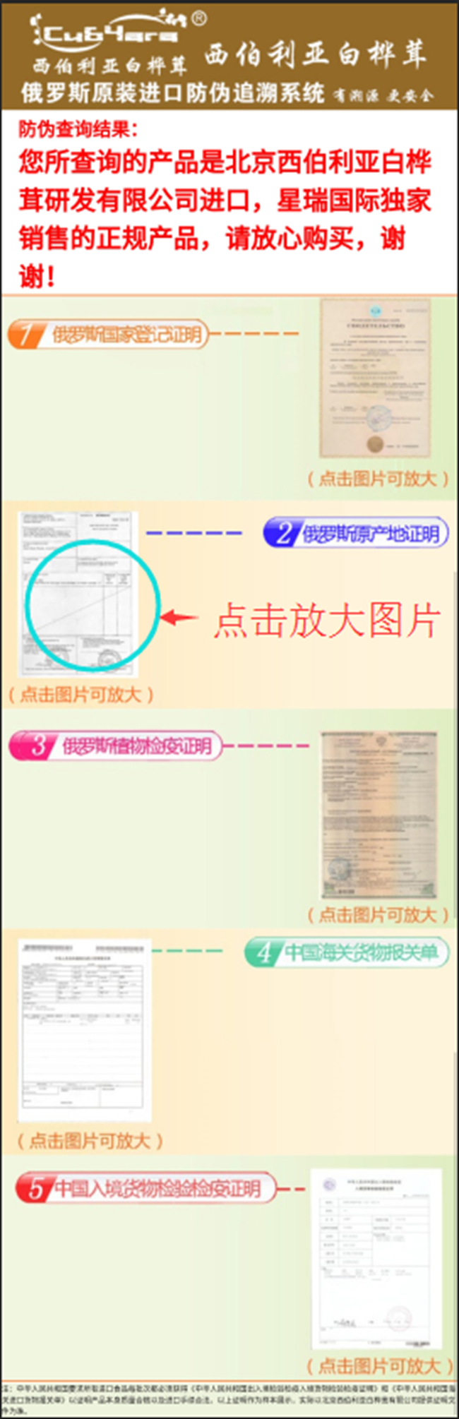 2.1正品,提示信息“ 您所查詢的產(chǎn)品是北京西伯利亞白樺茸研發(fā)有限公司進(jìn)口,星瑞集團(tuán)獨(dú)家銷售的正規(guī)產(chǎn)品,請(qǐng)放心購買,謝謝! ”